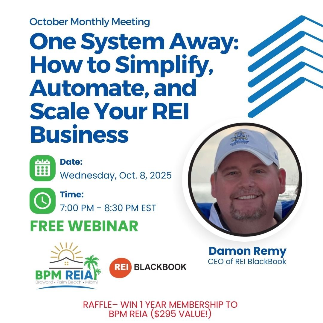 Join us for BPM REIA’s October Monthly Meeting featuring Damon Remy, Chief Everything Officer of REI BlackBook, for a game-changing session designed to simplify and supercharge your real estate business.