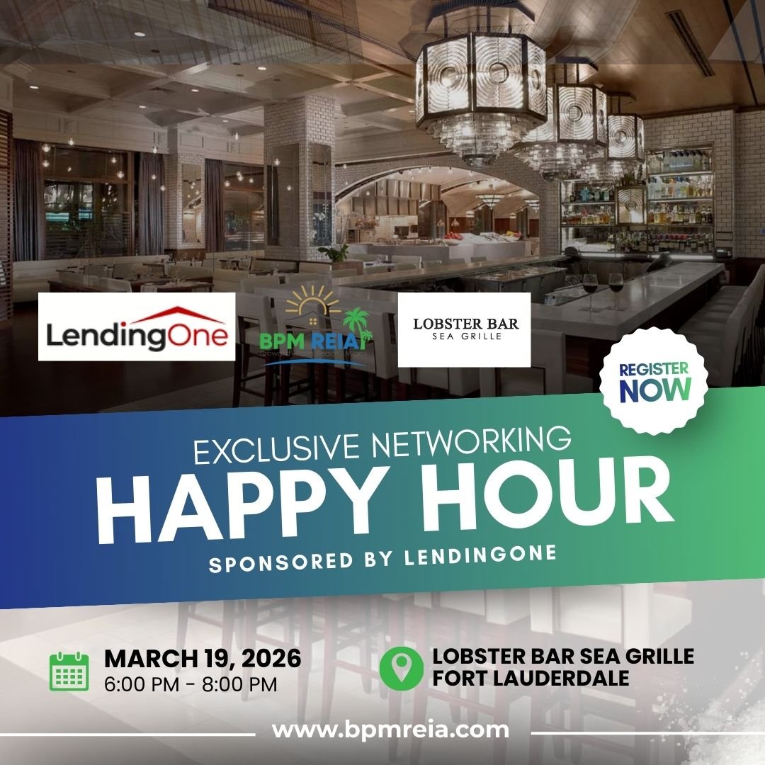 Join BPM REIA for a private, members-only networking happy hour on January 15th, 2026, from 6:00 PM to 8:00 PM at Lobster Bar Sea Grille in Fort Lauderdale.
